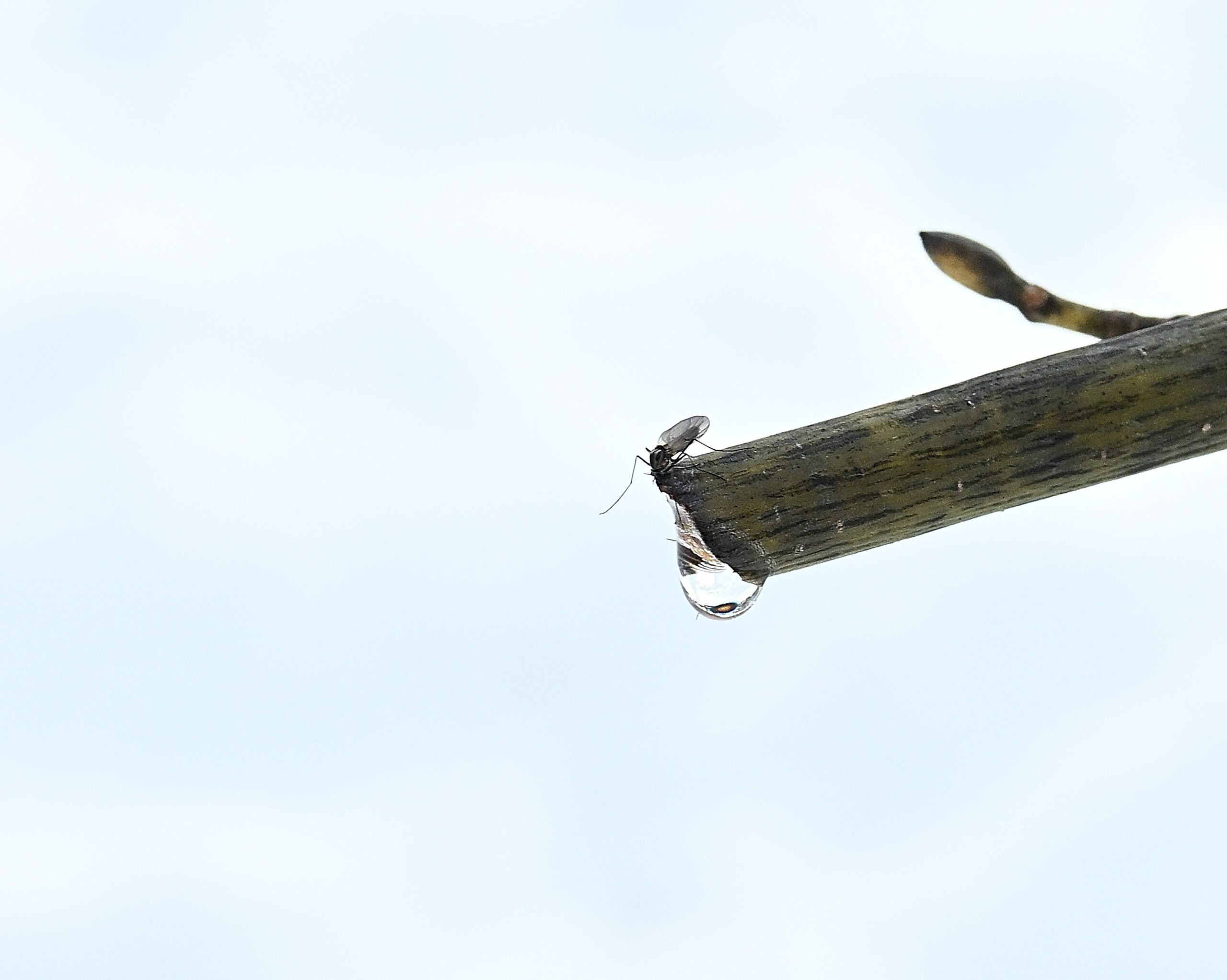 ノウサギがかみ切ったウリハダカエデの枝から甘い汁、それを小さな虫たちがなめています。